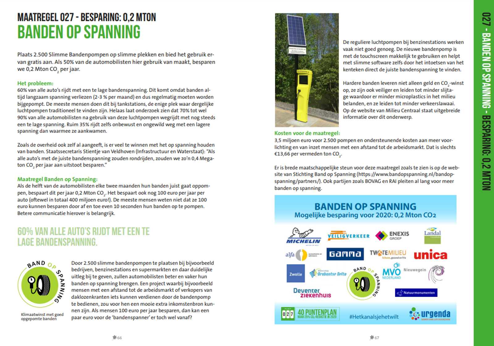 Marjan Minnesma, directeur van Urgenda, over de Slimme Bandenpomp van Band op Spanning: “Een andere maatregel voorziet in een nieuwe bandenpomp, die werkt op zonnepanelen. Met het apparaat kunnen burgers de banden van hun auto op spanning brengen. Als de helft van de automobilisten elke twee maanden hun banden juist gaat oppompen, bespaart dit per jaar 0,2 megaton aan CO₂–uitstoot. De apparaten worden onder meer bij supermarkten geplaatst.”